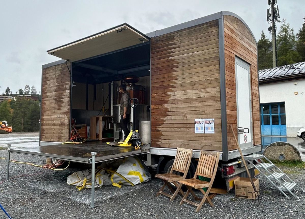 Dasper la plazza da ballapè es parcà ün char. Aint il char as rechatta ün grond butschin d’arom. I savura dad öla da günaiver. Reto Gabriel lascha güsta oura ün liquid our d’üna spina. Quai es ün’öla eterica prodota sül lö. Fatta è’laour da manzinas da la Val S-charl. Reto Gabriel fa part dal proget «destillar ölas etericas» da l’Unesco Biosfera Engiadina Val Müstair.