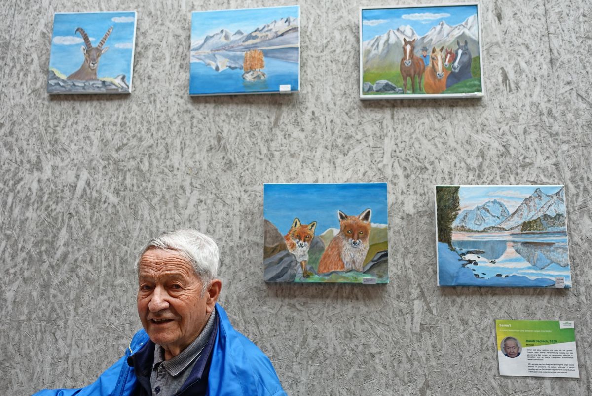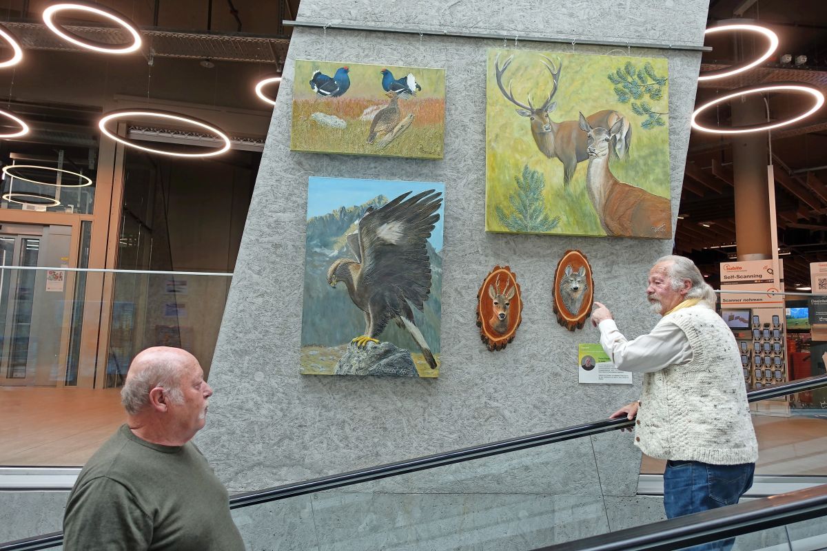 Künstlerinnen und Künstler kamen an der SenArt-Vernissage ins Gespräch: Peter Picenoni (links) und Toni Weishaupt fachsimpeln über die dreidimensionale Maltechnik des Wolfsportraits.