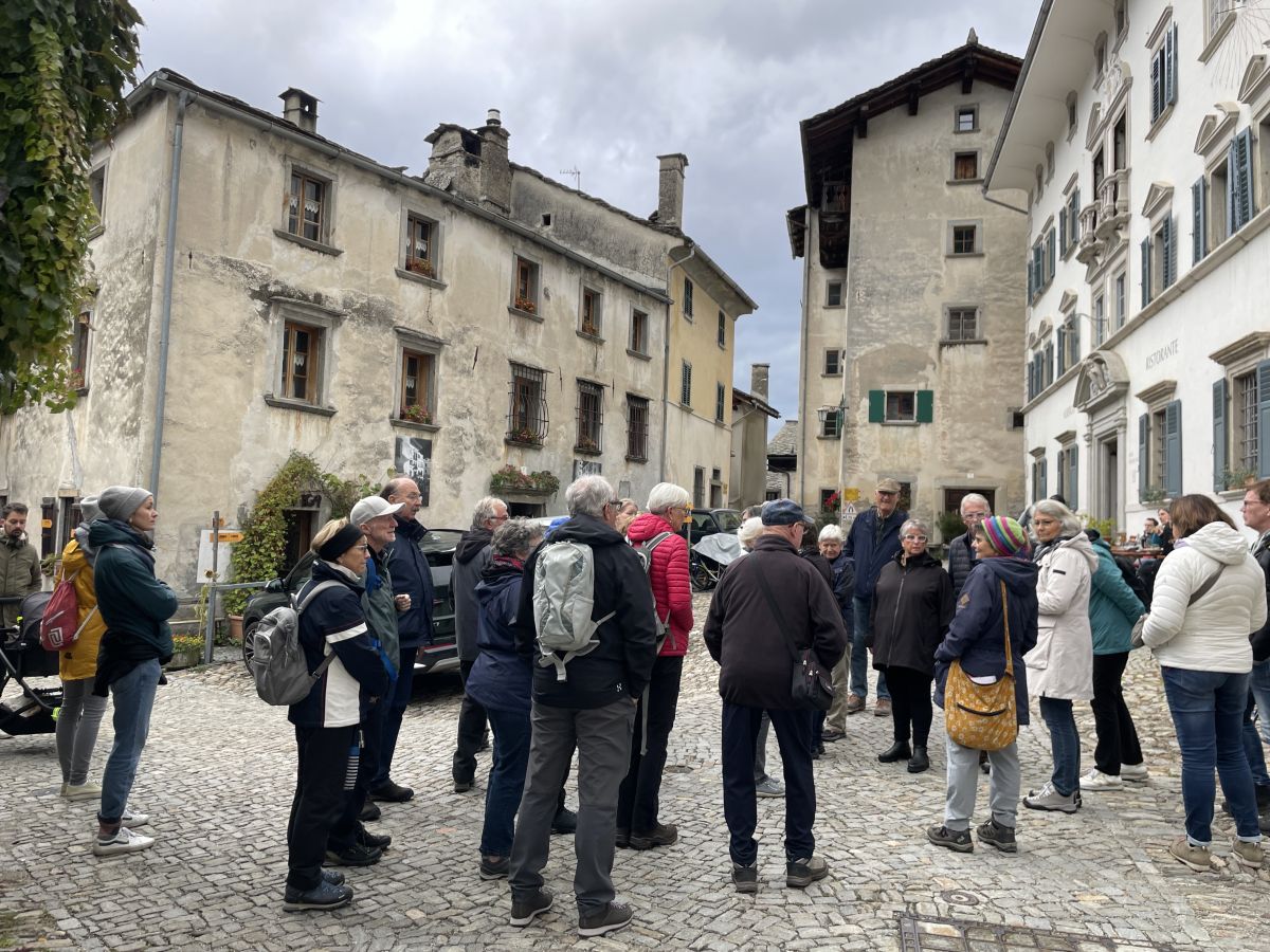 Für einen kurzen Exkurs zum Thema Baukunst führt Renata Giovanoli die Gruppe an den unteren Dorfrand. Von hier aus hat man einen guten Blick auf die Häuser. Zu sehen sind auch Häuser im Walserstil. Soglio hatte zwei Alpen auf der anderen Seite des Berges, und so kamen zum Teil Ehen unter Bergellerinnen und Walser oder umgekehrt zustande. Bei den Steinhäusern ist der Einfluss der italienischen Bauarbeiter zu sehen. Auch die Dächer mit Steinplatten zeugen davon.