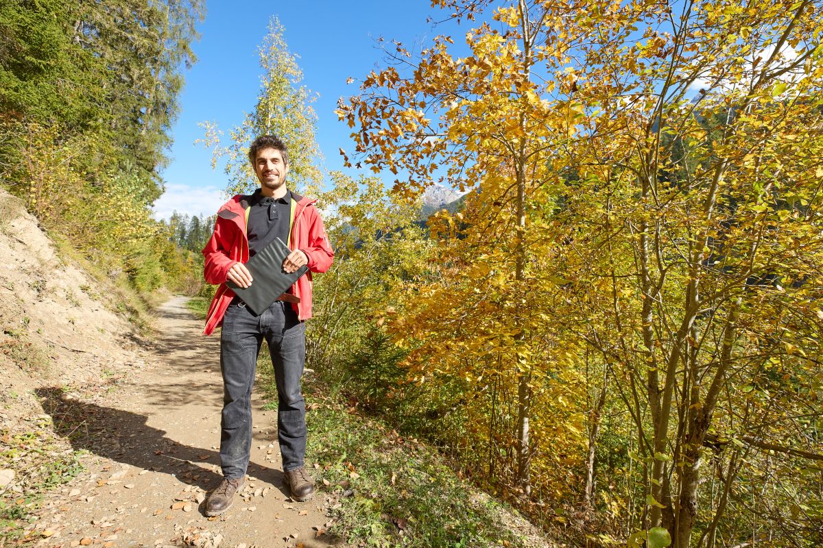 Giorgio Renz, indschegner forestal da l’Uffizi da god, in gir tras il god da Sfondraz (fotografia: Michael Steiner).