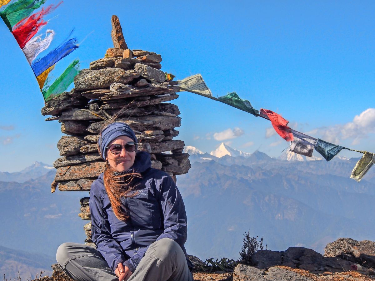 Tina Roner sün üna muntogna i’l Butan, davant las binderas tipicas pel Himalaja (fotografia: mad).