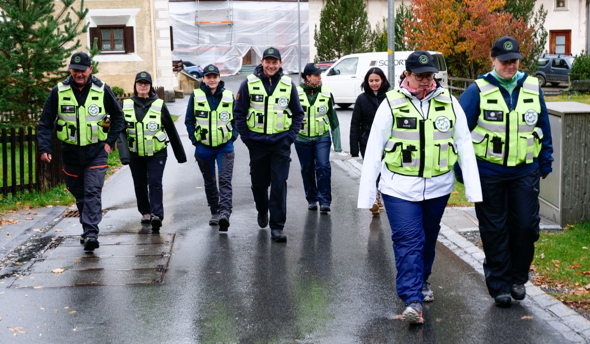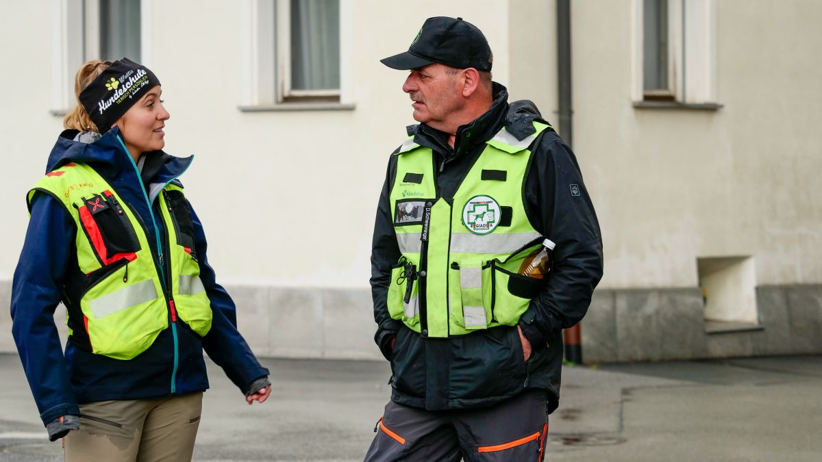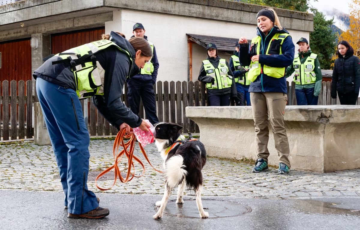 Szene aus einer Übung des Vereins der Personenspürhunde Engiadina und Protagonistin Maja Schmidli aus Samedan. Ihr fünfeinhalbjähriger Border Collie «Jazz» ist kurz davor, eine versteckte Person zu finden.