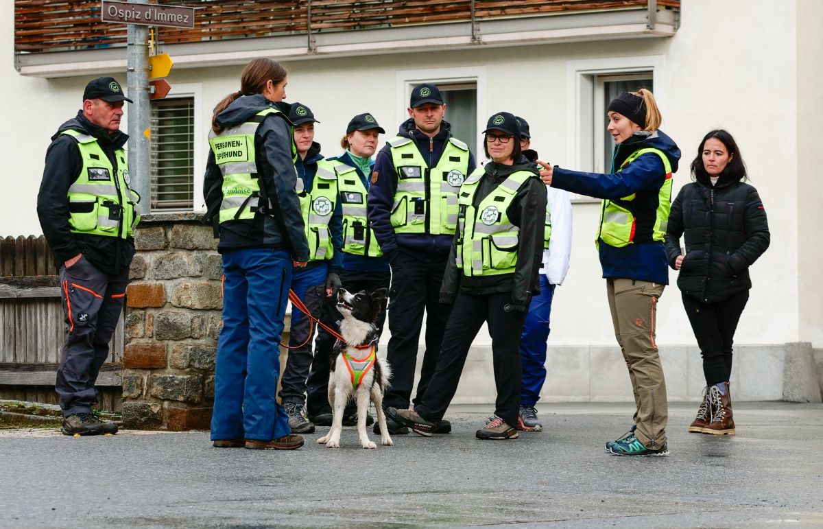 Maja Schmidli (links) gibt, beobachtet und angeleitet von der Hundeführerin Jessy Kalbermatter, ihrem «Jazz» eine zuvor präparierte Duftmarke der vermissten Person zu erschnuppern, bevor sie sich gemeinsam auf die Suche machen. Fotos: Jon Duschletta