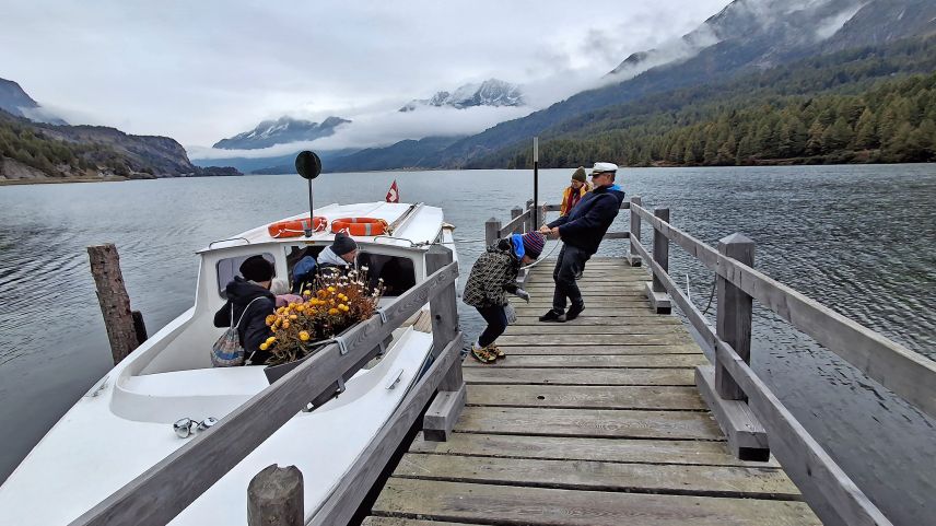 Gipfelpanorama, türkis schimmerndes Wasser, sich sanft im Wind wiegende Lärchenwälder am Ufer: Kapitän Franco Gianis Kursschiff im Oktober 2024 auf dem Silsersee.