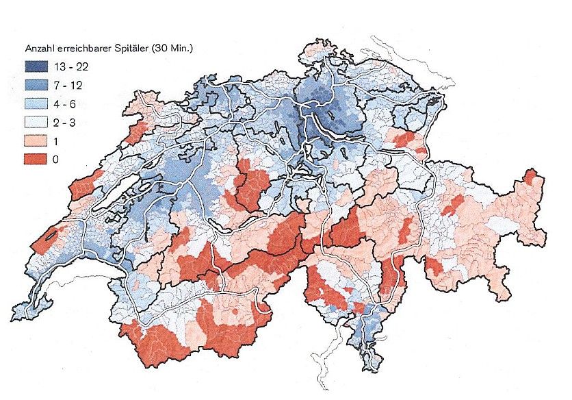 Wie viele Spitäler können innerhalb von 30 Minuten erreicht werden? Die kantonalen Unterschiede sind gross. Foto: Präsentation DJSG