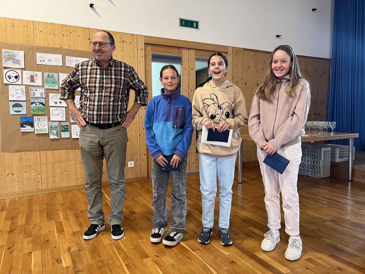 Il vicepresident da la cumischiun dal Parc Naziunal Svizzer, Christoph Flory, ha surdat in sonda a Sent ils premis a Laila Grass, Noemi Müller e Chiara Staub (fotografia: David Truttmann).