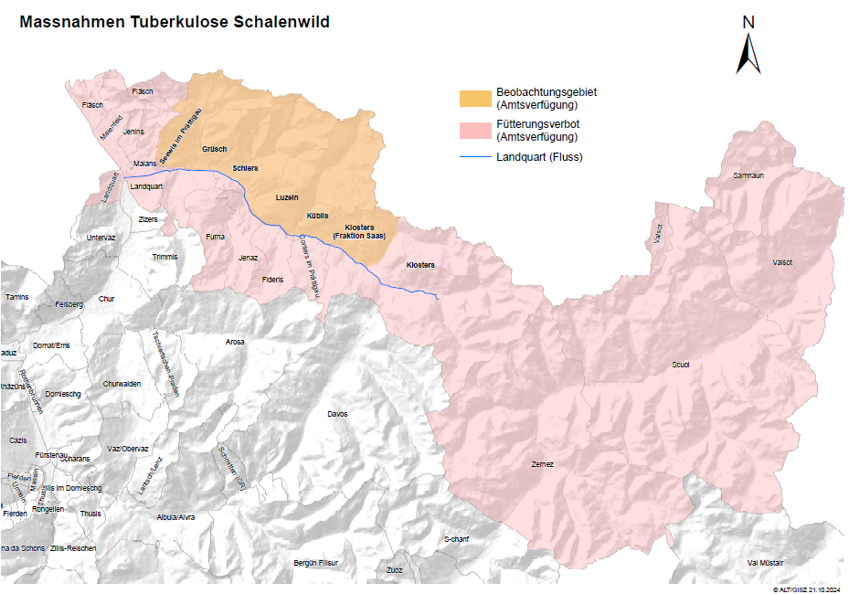 Die Ausbreitung der Tierseuche im Montafon in Richtung Graubünden erfordert gemäss Tierseuchenverordnung Massnahmen für eine verstärkte Überwachung. Das Amt für Lebensmittelsicherheit und Tiergesundheit (ALT) hat deshalb in Absprache mit dem Amt für Jagd und Fischerei (AJF) und dem Bundesamt für Lebensmittelsicherheit und Veterinärwesen (BLV) ein Beobachtungsgebiet ausgeschieden, in welchem erlegte und tot aufgefundene Rothirsche auf Tuberkulose zu untersuchen sind. Betroffen sind die Gemeindegebiete von Seewis, Grüsch, Schiers, Luzein, Küblis und die Fraktion Saas in Klosters, die nordöstlich von Landquart liegen.