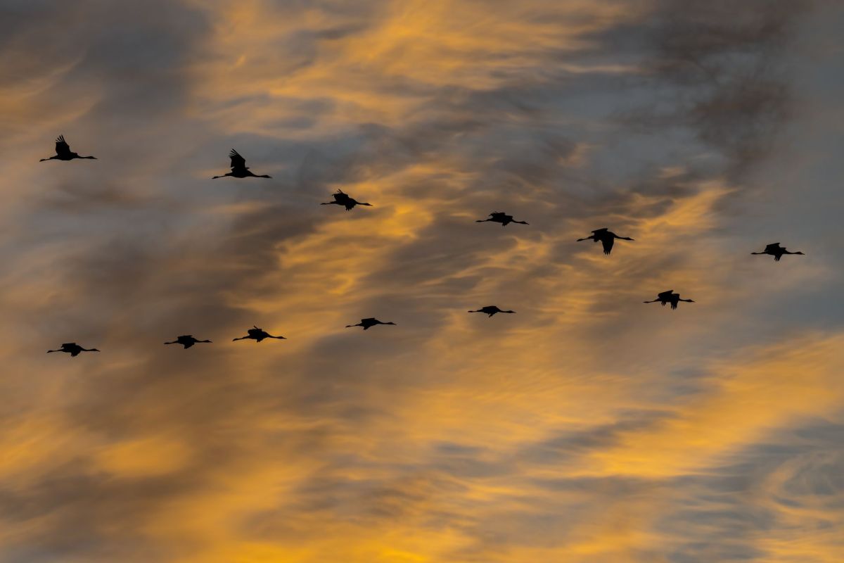 2011 aber geschah Aussergewöhnliches: In der Schweiz wurden während des Herbstzugs über zehn mal mehr Kraniche beobachtet als üblich. Seither blieb die Zahl beobachteter Kraniche mit Schwankungen hoch. Was ist passiert? Ein Teil der Kraniche, die normalerweise den ungarischen Hortobágy-Nationalpark passieren, um dann via Italien nach Nordafrika zu gelangen, änderte die Route. Statt über Italien nach Nordafrika flogen sie über die südfranzösische Camargue nach Spanien. 2011 wurde dieser Routenwechsel vermutlich durch starke Ostwinde unterstützt, aber auch in den Folgejahren wurde der neue Zugweg rege genutzt. Kraniche haben keine genetisch definierten Zugrouten, die erfahrenen Tiere geben ihr Wissen an die anderen weiter. Die neue Zugroute durch Mitteleuropa scheint den Kranichen zu behagen. «Da die Schweiz auf dem Weg zwischen Hortobágy und der Camargue liegt, dürfen auch wir uns vermehrt an den sehnsüchtig anmutenden Rufen durchziehender Kraniche erfreuen», schreibt die Vogelwarte.