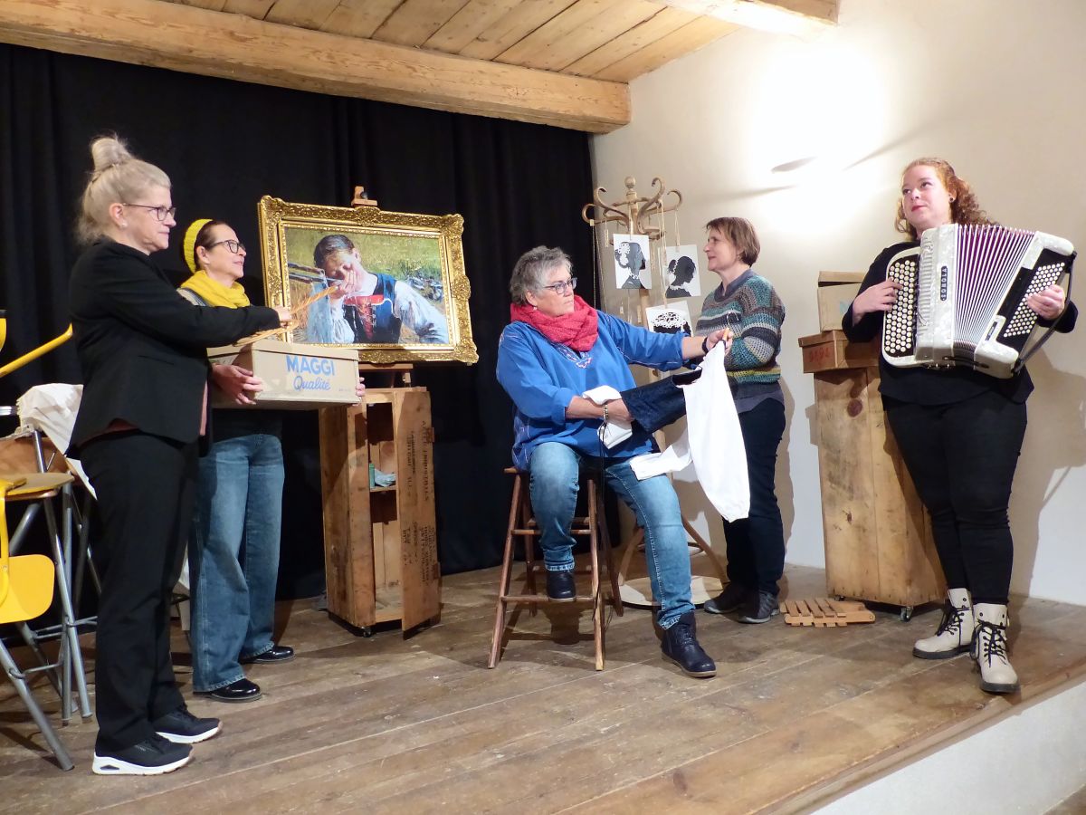 Las acturas e la musicista (da schnestra) Marlen Feurer, Anita Mark, Annina Giovanoli, Monika Curschellas e Sidonia Caviezel sül palc i’l Piertan da la Grotta