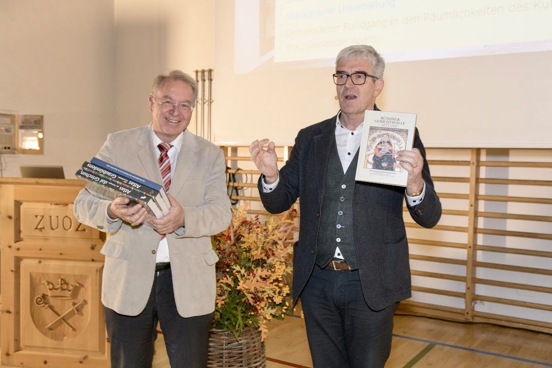 Lucian Schucan, Präsident Kulturarchiv Oberengadin, und Regierungspräsident Jon Domenic Parolini. Foto: Gian-Nicola Bass