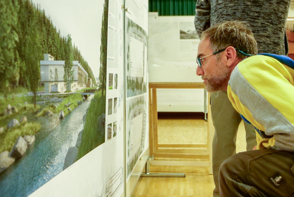 Darunter auch Marco Schmied, Mitinitiant des Vereins «Pro Eishalle Engadin», der die Projekte, allen voran das Siegerprojekt, ganz genau unter die Lupe nahm. Fotos: Jon Duschletta