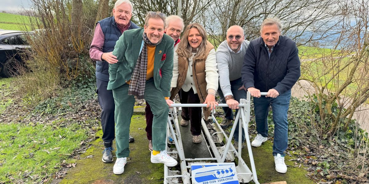 Felix Schlatter, Christian Jott Jenny, Martin Berthod, Marijana Jakic, Christoph Schlatter und Erich Schärer bringen den Anschiebe-Bob in Herrliberg in Bewegung (von links). Foto: Thomas Renggli