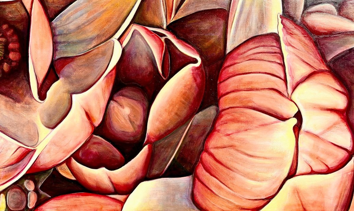 Die Künstlerin fokussiert kleine, zierliche Ausschnitte aus der Natur, von Blüten und Steinen oder auch von Lebewesen aus dem Meer. Sie zoomt diese in ihren Gemälden bis zur Abstraktion zu sanften, manchmal auch lauten und kräftigen Statements. Die meist intensiven Farben, die andeutungsvollen erotischen Formen und das Spiel von Licht und Schatten wirken verführerisch.