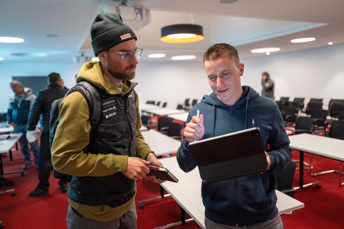 Nevin Galmarini im Gespräch mit Nationaltrainer Daniel Weis beim Snowboard-Weltcup in Scuol (Foto: Mayk Wendt).