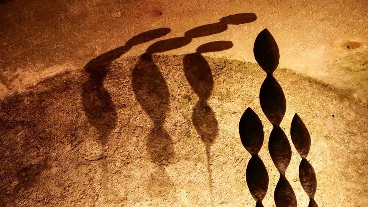 Unbetitelte Metallskulptur von Sara Masüger 2022 mit Schattenwurf im Kellergewölbe der Stalla.