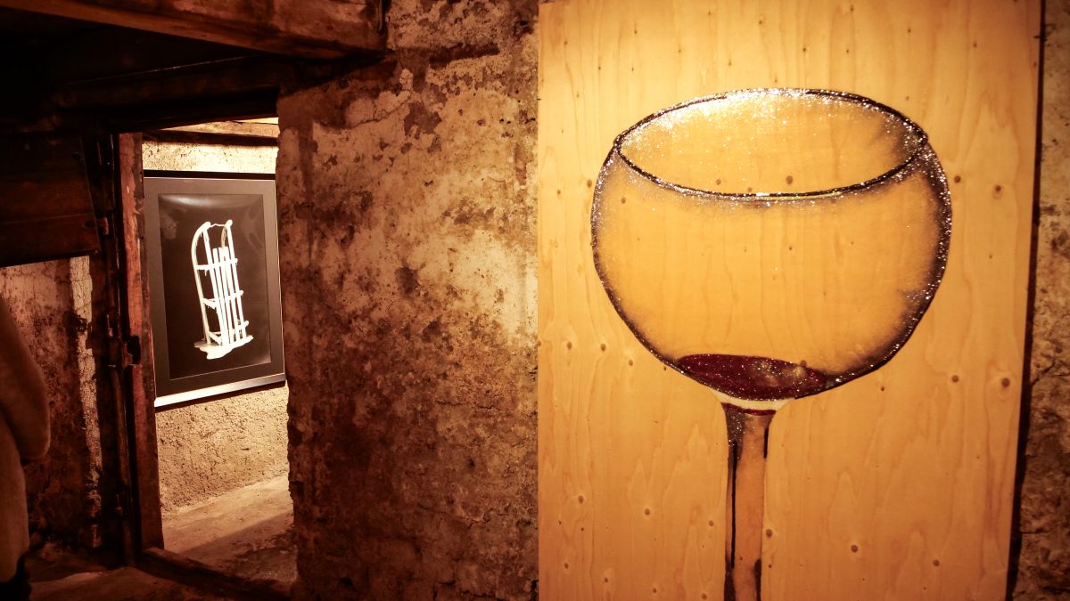 Holzschlitten von Daniel Meuli 2023, im Hintergrund Bergbilder von Conrad Jon Godly 2024. Fotos: Jon Duschletta