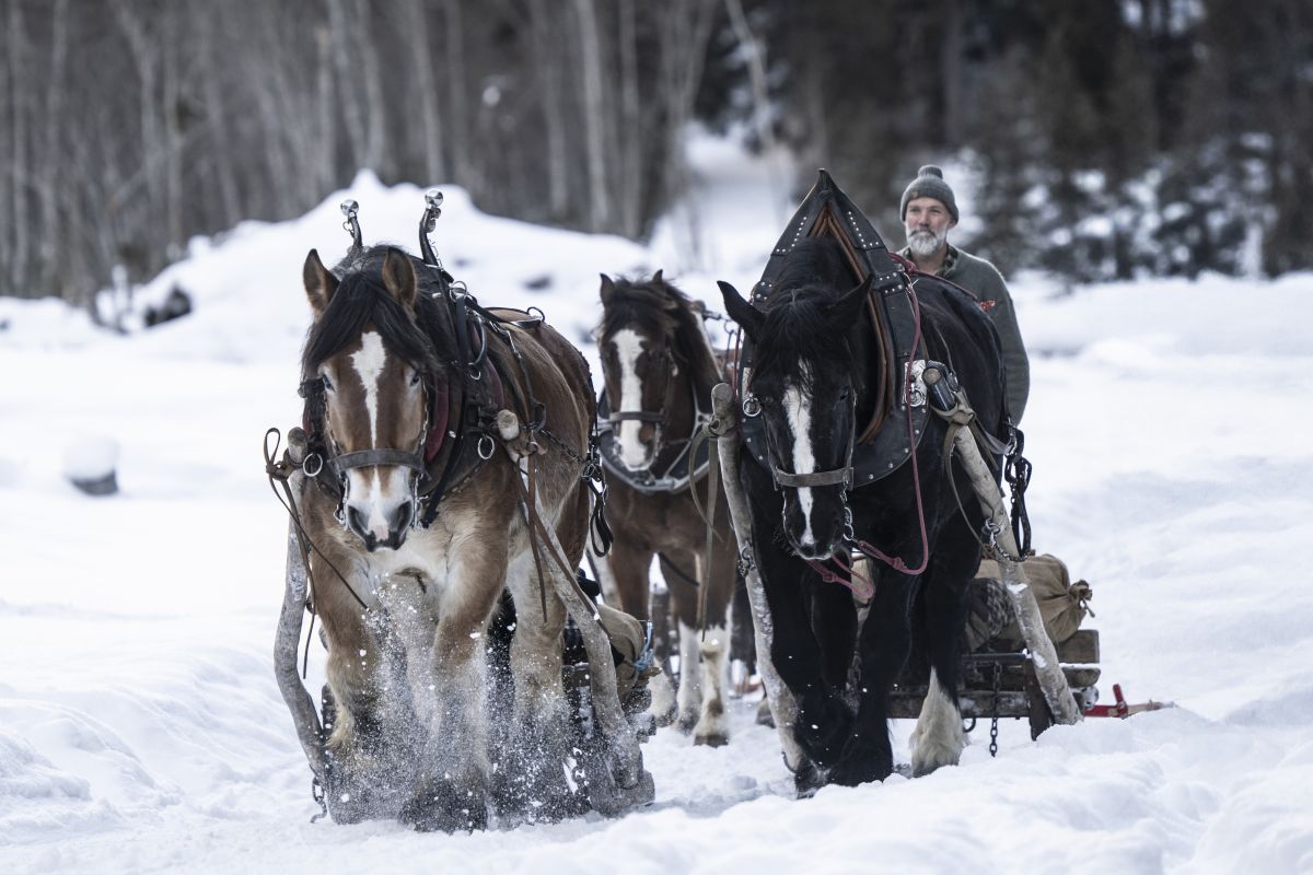 Gian Denoth fährt jeweils etwas früher los, um die Pferde zu tränken und zu füttern. Mit einem Kaffee empfängt er seine Mitarbeiter kurz vor neun Uhr in der Küche des Hofs – Incarom-Pulver mit heissem Wasser, das auf dem Holzofen erwärmt wurde. Die Milch ist über Nacht in der Glasflasche gefroren. Viel Zeit zum Plaudern bleibt ohnehin nicht. Die vier Pferde, die zum Holzführen eingesetzt werden, sind im Stall des Hofs untergebracht: der Freiberger Nestor, der Percheron Uranie und der Ardener Ariago. Nach der Kaffeepause werden die Tiere aus dem Stall geholt, gestriegelt und gezäumt. Wenige Minuten später geht‘s los.