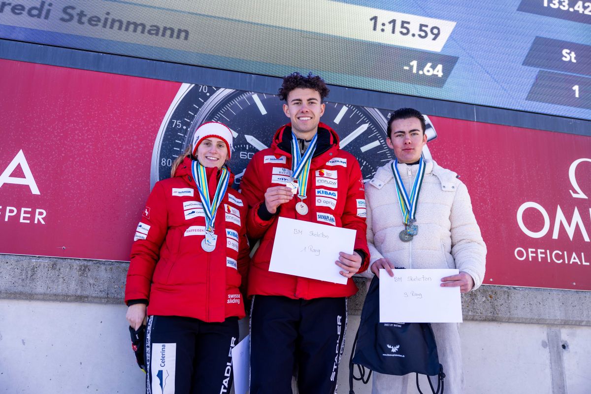 Skeleton-Bündermeisterschaft und Nico Baracchi Memorial mit St. Moritzer Siegertrio: v.l.: Sara Schmied, Vinzenz und Flurin Buff, alle vom SMBC. Foto: z. Vfg