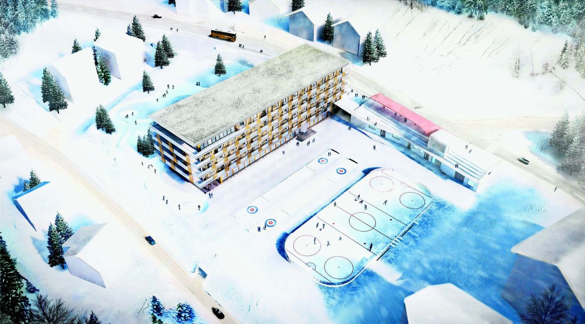 So soll das auf dem Rosegplatz geplante Familienhotel «Flaz» Pontresina mit knapp 200 Betten dereinst aussehen. Visualisierung: z. Vfg