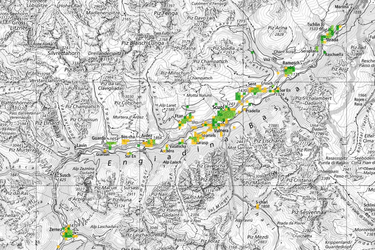 Il «atlas da bindel larg» dal BAKOM muossa quants pertschients dals edifizis sün ün quader chi han access a la rait da fibras opticas (carta: Swisstopo).