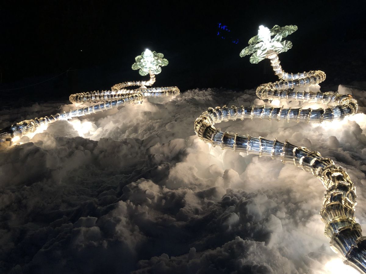 Künstler Christian Pellizzari mit seinen schlangenförmigen Eisglasblumen unterhalb des Waldhauses am See in St. Moritz