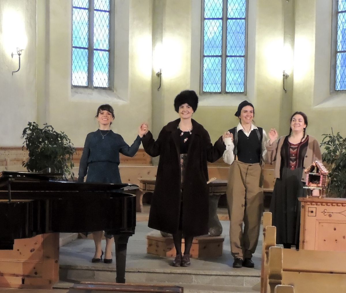 La pianista Elizaveta Parfentyeva e las acturas (da schnestra) Nora Bertogg (stria), Lisa May-Appenzeller (Ansin) e Sara-Bigna Janett (Grettina) han giodü l’applaus merità (fotografia: Benedict Stecher).