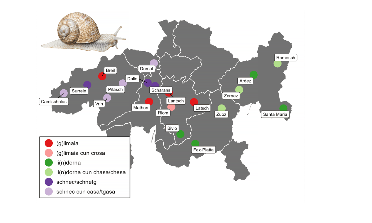 Fingià pel pled «Schnecke» daja üna pruna variantas rumantschas: A Breil es quai la «glimaia», a Domat il «schnec», a Riom «la glimaia cun crosa» ed ad Ardez «la lindorna». Documentar quista richa varietà da dialects rumantschs ed ...