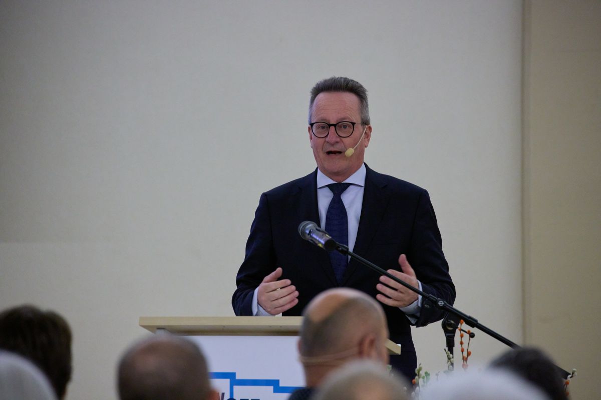 Martin Schmid, il president dal cussagl administrativ, ha dat il bainvgnü a var 80 persunas a la 70avla radunanza generala da la Ouvras Electricas d’Engiadina SA (fotografia: Michael Steiner).