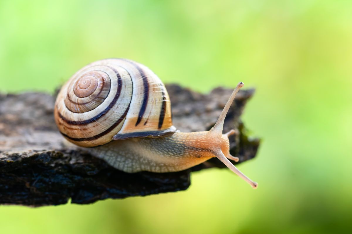 La lindorna da frus-chaglia, Hain-Schnirkelschnecke (Cepaea nemoralis), vain eir numneda stimulatura dal terrain (fotografia:ProNatura/Stéphane Vitzthum).