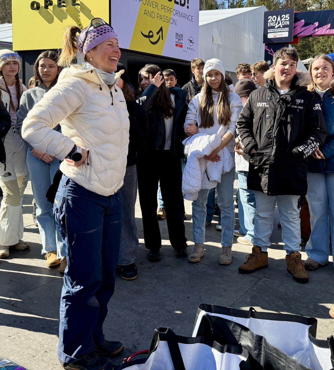 Bevor die Jugendlichen sich auf das Gelände verteilen, erhalten sie noch Mützen, T-Shirts und Stirnbänder von verschiedenen Sponsoren sowie eine Kurzeinführung zu den Disziplinen und den Wettkampfregeln von Kim Born. Sie ist eigentlich Praktikantin für die Opel Freeski- und Snowboard-Tour, hilft nun aber an der FIS-Freestyle-WM aus.