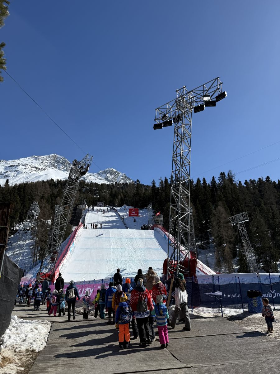 An einer etwas erhöhten Bande stehen die Schülerinnen und Schüler der sechsten Primarstufe von Andeer. Sie sind an diesem Morgen sehr früh aufgestanden, um ins Engadin zu reisen. Den Morgen haben sie auf Corviglia verbracht, wo sie die Aerials-Wettkämpfe mitverfolgt haben. Dabei hatten alle Kinder Grund zu jubeln. «Auf dem Podest standen drei Nationen, die auch in unserer Klasse vertreten sind: die USA, die Ukraine und die Schweiz», sagt Lehrer Christoph Würgler. Den Nachmittag verbringt die Klasse nun bei der Big-Air-Schanze.