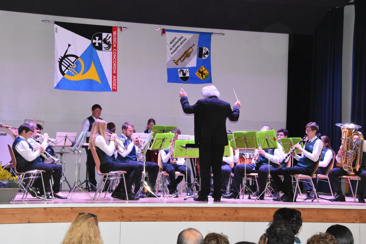 ... e la Musica da giuventüna Engiadina Bassa cul dirigent Ivan Nussio han tratgnü il public ad Ardez (fotografia: Nicolo Bass).