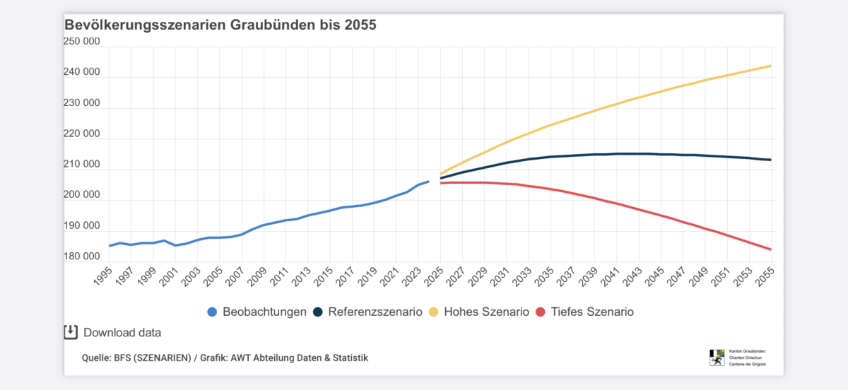 Der Prognosezeitraum dauert von 2025 bis 2055. Heute leben 206 111 Personen in Graubünden. Bis 2043 wird die Bevölkerung auf über 215 000 Personen anwachsen und dann bis 2055 wieder auf 213 000 schrumpfen. «In Graubünden haben wir bereits heute eine Situation mit negativer natürlicher Bevölkerungsbewegung, also mehr mit mehr Todesfällen als Geburten», sagt Luzius Stricker, Leiter Daten und Statistik beim Amt für Wirtschaft und Tourismus. Diese Tendenz spitze sich in Zukunft nochmals zu. Auch erwartet er Veränderungen in den internationalen und interkantonalen Migrationsbewegungen.