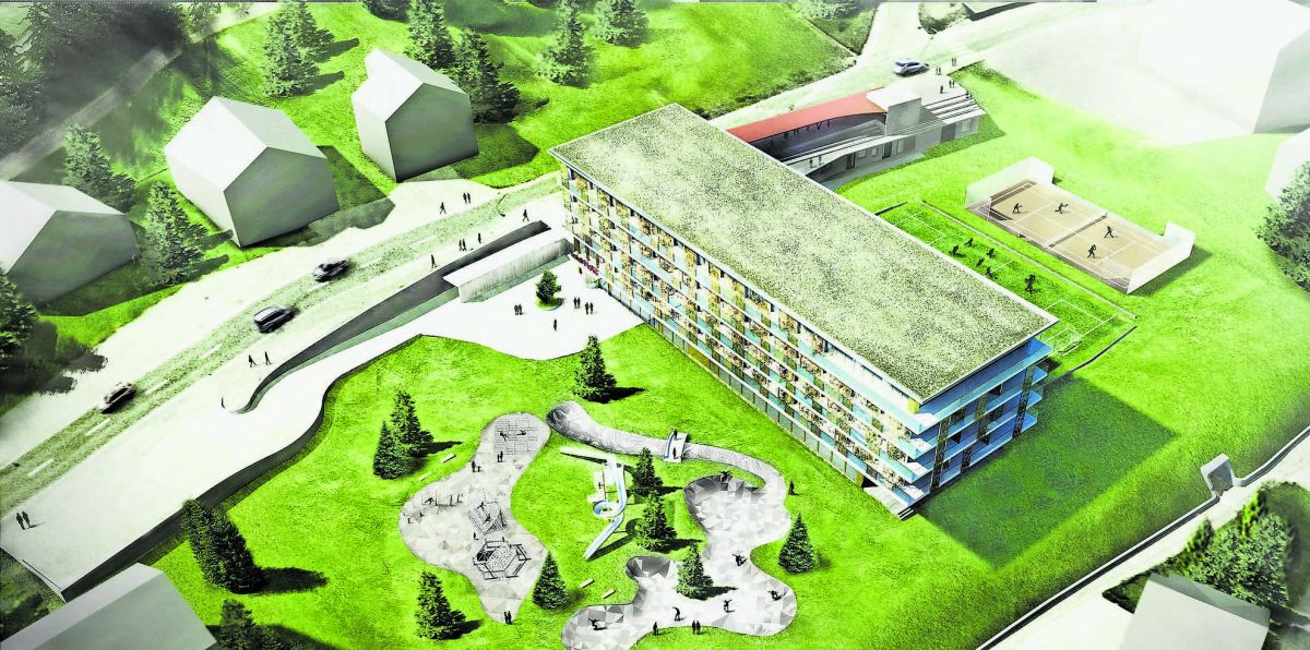 Eine Visualisierung des geplanten Hotels Flaz im Sommer. Visualisierung: z. Vfg