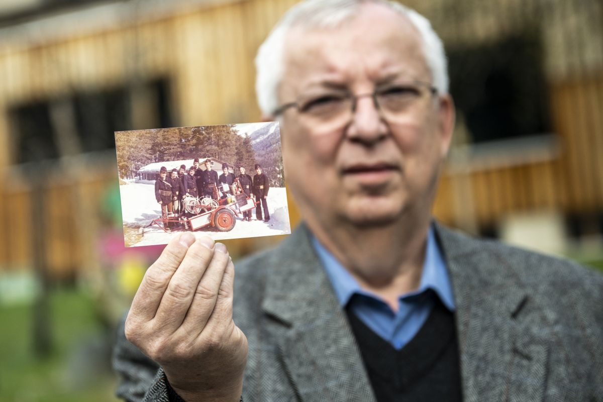 Etienne Aepli war Teil der letzten Schüler-Feuerwehr in Avrona. Er zeigt ein Bild der Feuerwehrgruppe von 1973. Foto: Mayk Wendt