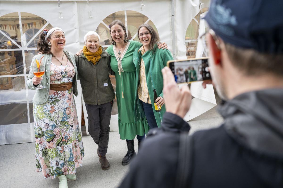 Die ehemalige Mitarbeiterin Vre Bertschinger aus Sent wird mit ehemaligen Schülerinnen fotografiert. Foto: Mayk Wndt