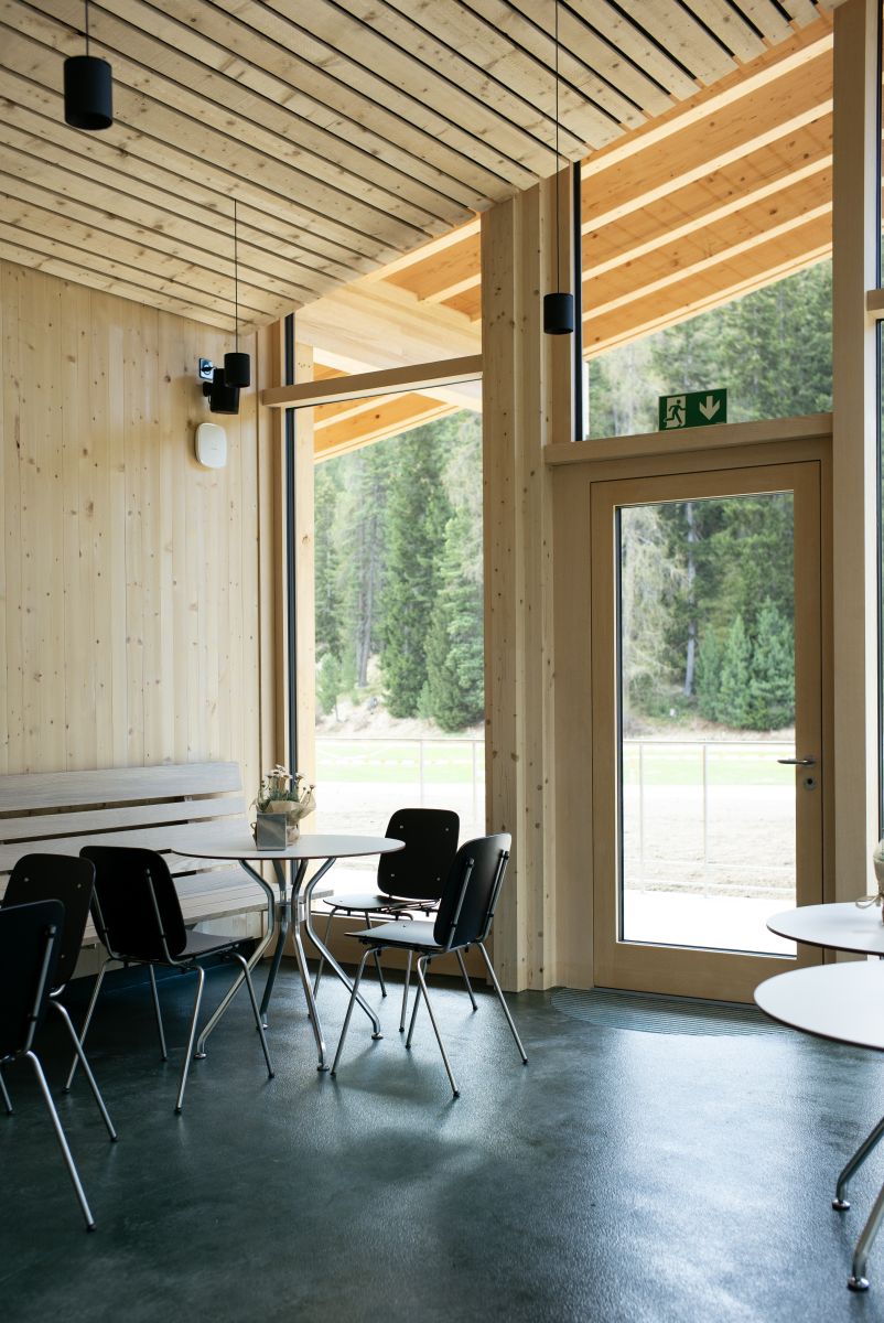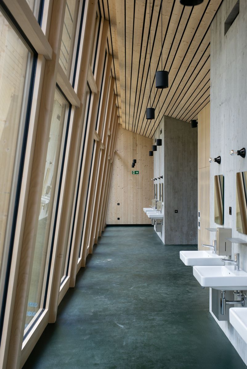 «Das Gebäude bietet eine hohe Aufenthaltsqualität und bildet das neue Zentrum der gesamten Anlage», schreibt die Gemeinde in einer Medienmitteilung. Der Büroraum mit Kiosk ist die zentrale Anlaufstelle für Gäste. Ein Aufenthaltsraum mit kleiner Küche und gedeckter Terrasse bietet einen Treffpunkt ausserhalb von Camper oder Zelt. Zudem gibt es Einrichtungen zum Geschirrspülen und Wäschewaschen.