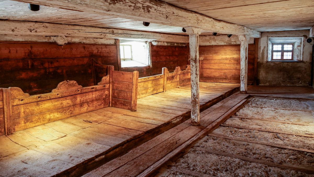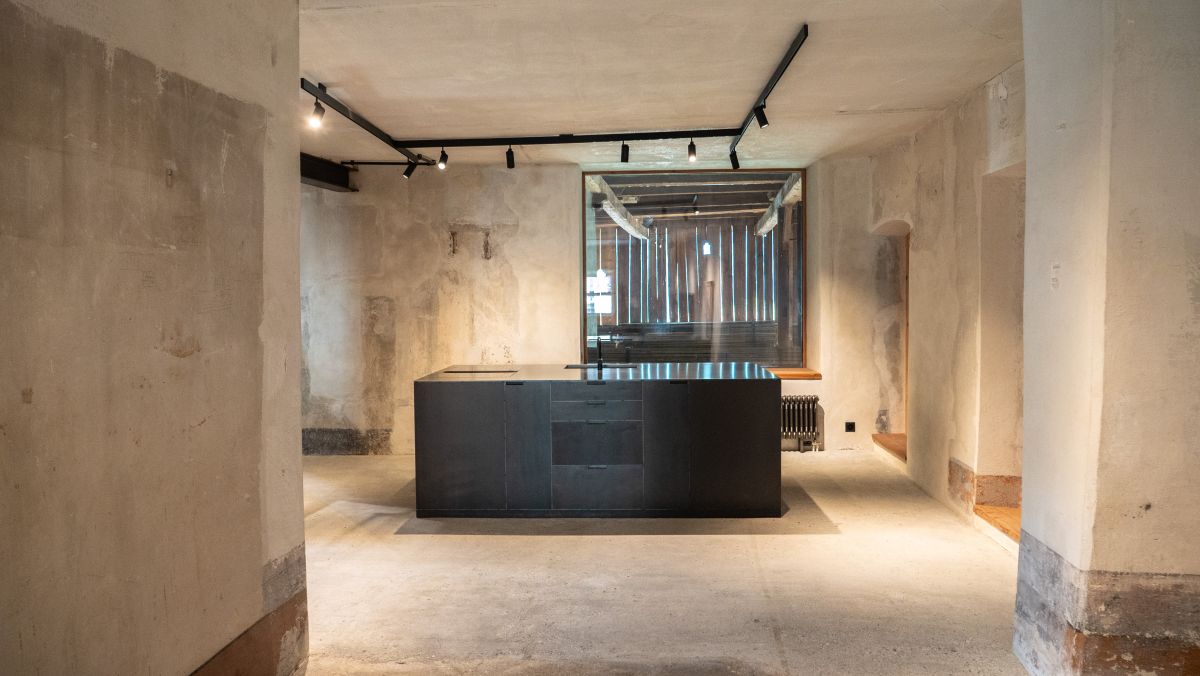 Grosse, auf den ursprünglichen Zustand zurückversetzte Räume mit moderner Einbaute und Sicht in den kathedralähnlichen Heustall.