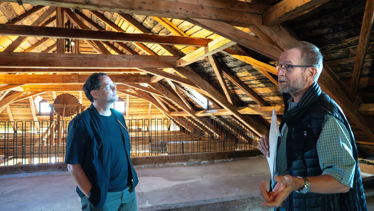 Remo Derungs (links) und Jon Andrea Könz im imposanten Dachstuhl, einem sogenannt liegenden Dachstuhl, der Chesa Gregori in Zuoz. Fotos: Jon Duschletta