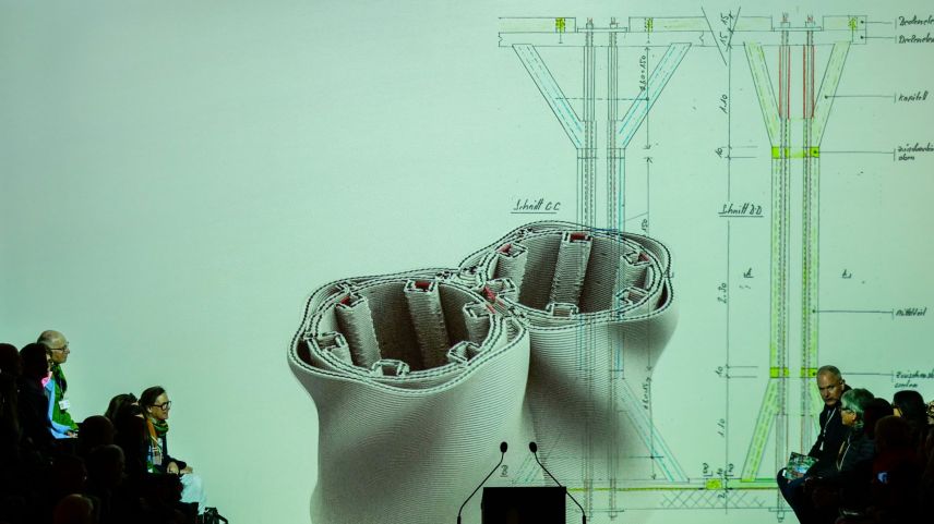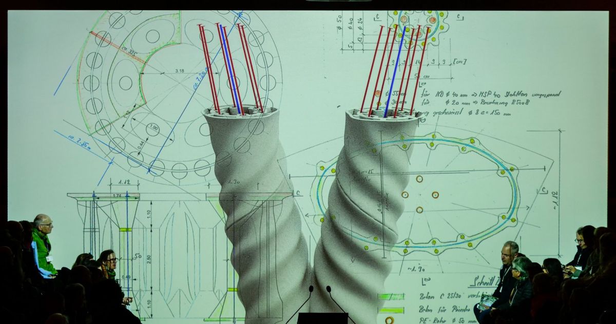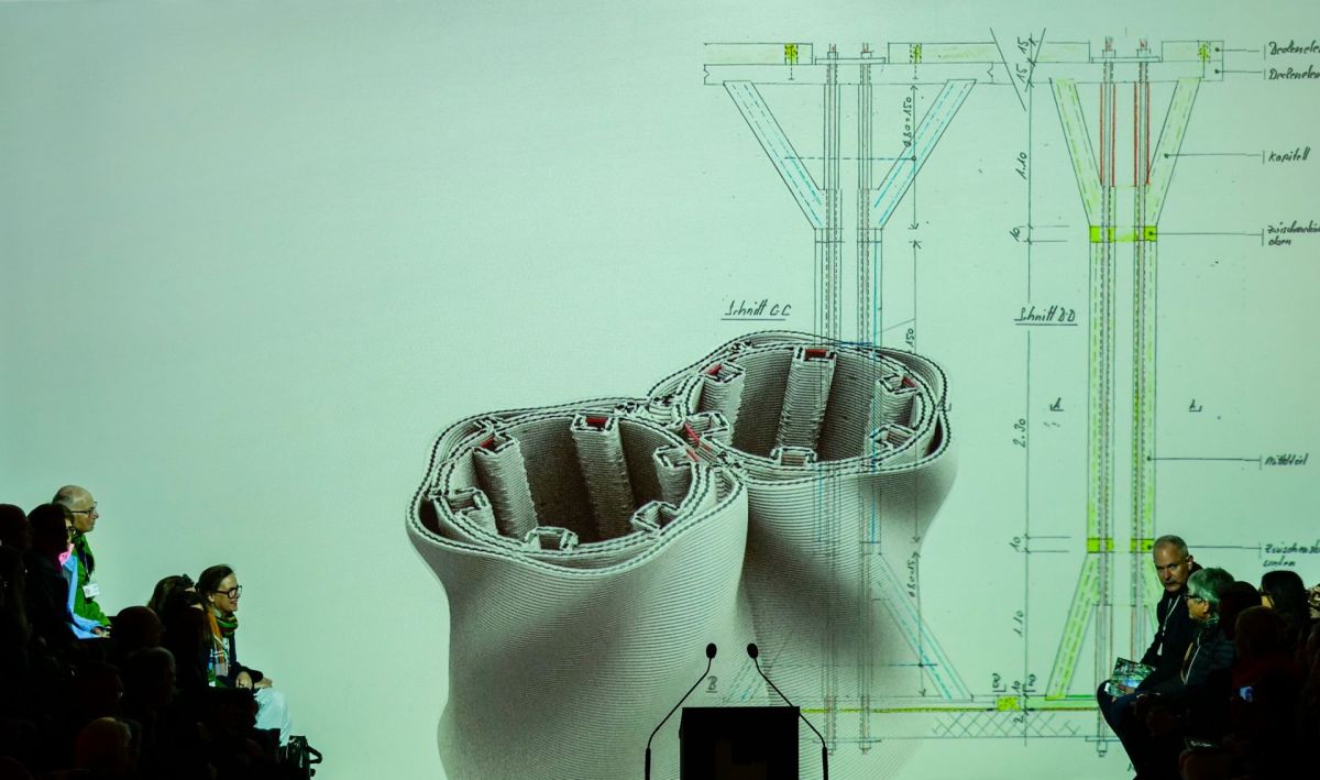 Selbst digitales Bauen entbehrt nicht der altbewährten Handwerkskunst des Bauingenieurs. Hier auf eine Leinwand projizierte Studiendetails zu den Säulen des Weissen Turms.