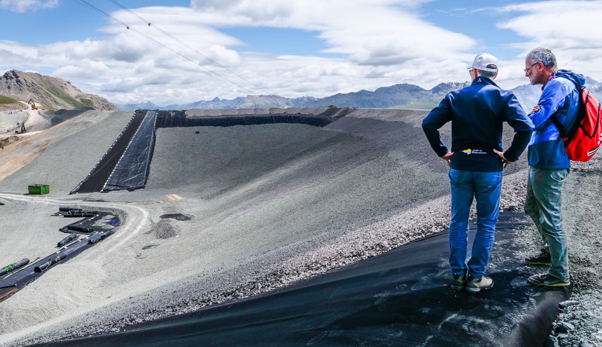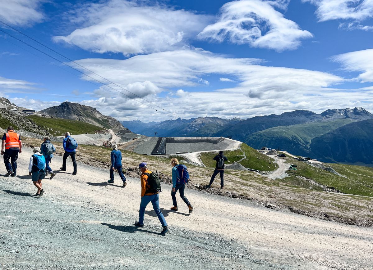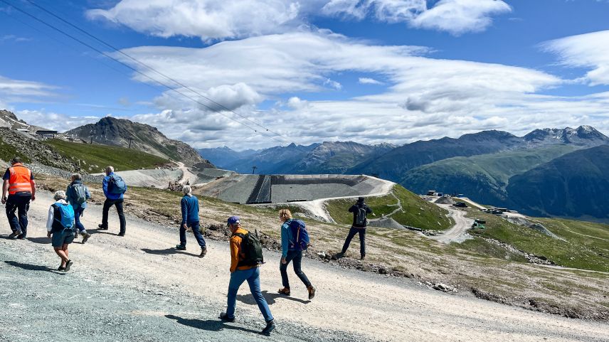 Adrian Jordan (links) mit einem Teilnehmer der Baustellenführung auf dem Damm des neuen Lej Nair Pitschen auf Corviglia. Am 13. August wird der Speichersee vom dafür zuständigen Bundesamt für Energie abgenommen und kann danach befüllt werden.
