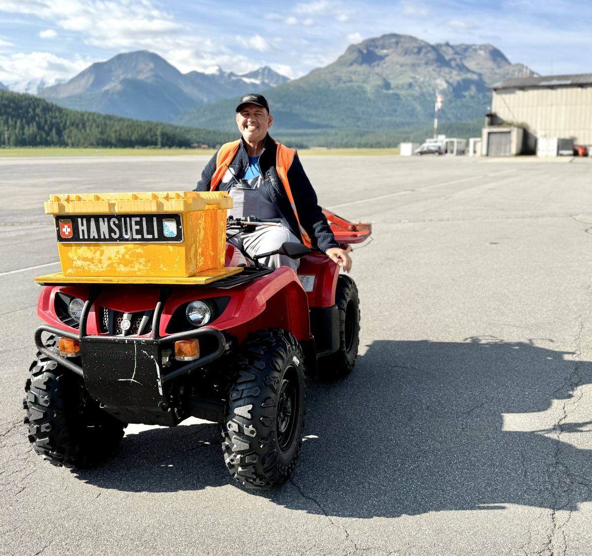 Hansueli ist in Winterhur aufgewachsen und wohnt in Dinhard. Wann immer er frei hat und Bedarf ist, trifft man ihn beim Segelflugbetrieb am Flugplatz Hegmatten bei Winterthur an. Schon als 14-Jähriger hat er hier gejobbt. Nach der obligatorischen Schulzeit hat er eine zweijährige Lehre in der Landwirtschaft absolviert. Hansueli lebt mit einer Behinderung, ausgelöst durch einen epileptischen Anfall. Dennoch darf er über kurze Strecken Auto fahren. Auf dem Areal des Flughafens Samedan ist der 55-Jährige immer mit dem Quad unterwegs.