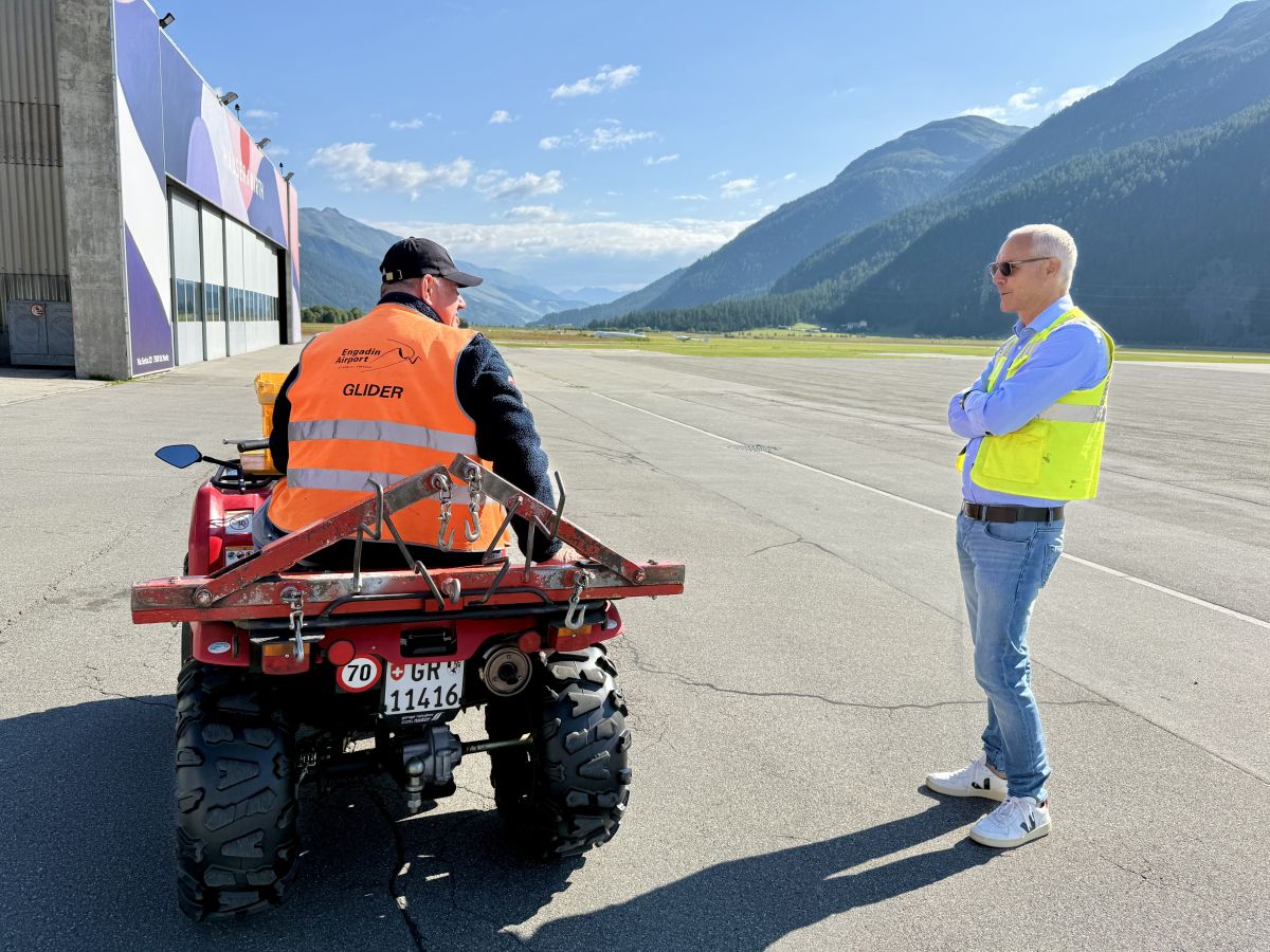 Man kann ohne Übertreibung behaupten, dass Hansueli Wiesendanger am Flughafen in Samedan bekannt wie ein bunter Hund ist. Das liegt nicht etwa an seinen 191 Zentimetern Körpergrösse oder an den Schuhen der Grösse 51. Hansueli ist ein präsenter Mensch, engagiert, begeisterungsfähig. Wenn er auf dem Platz ist, wissen es alle Mitarbeitenden. Hansueli meldet sich bei Dienstantritt stets per Funk an und wünscht allen einen guten Morgen. Erst dann startet er in den Arbeitstag.