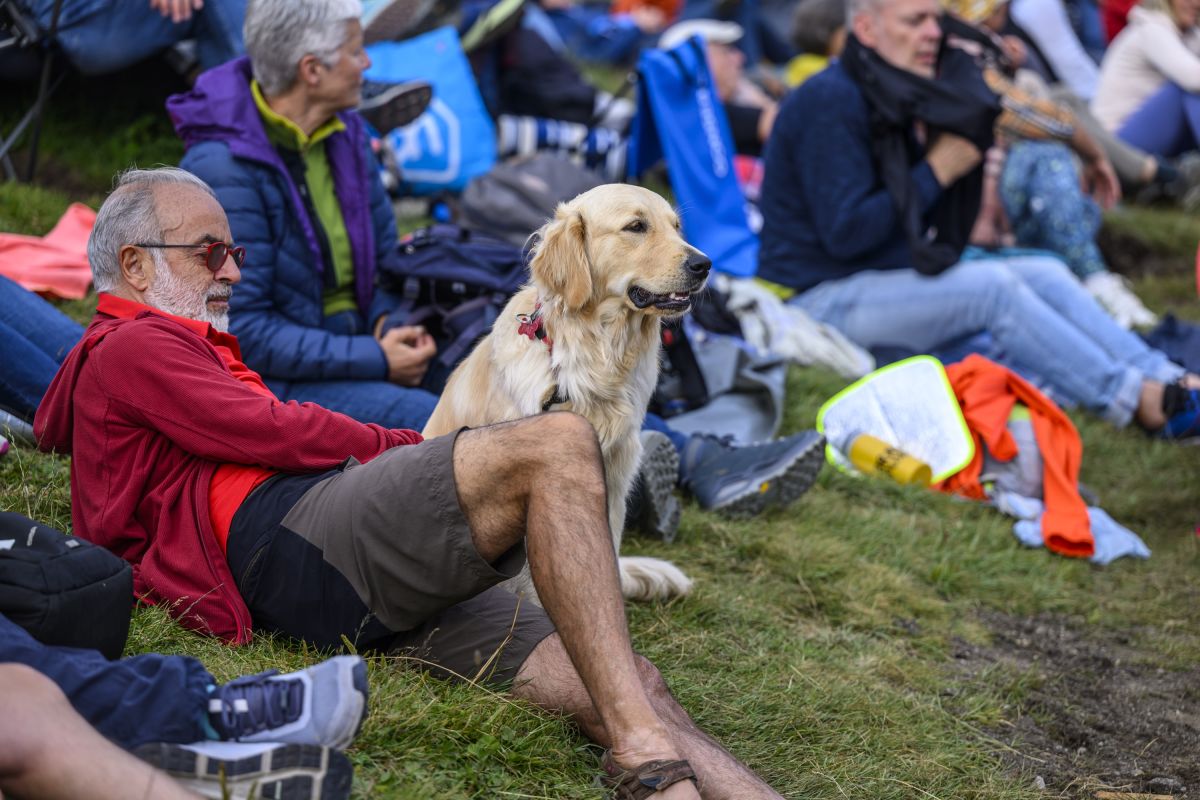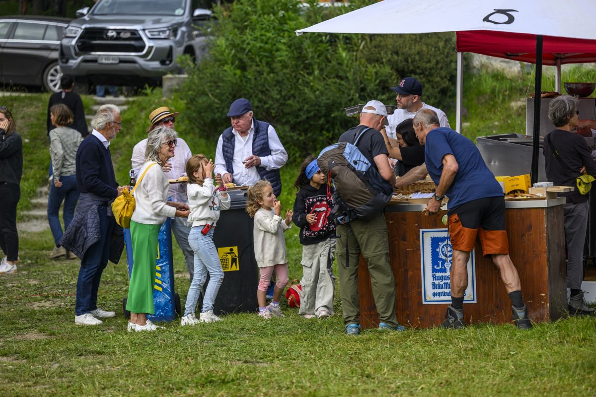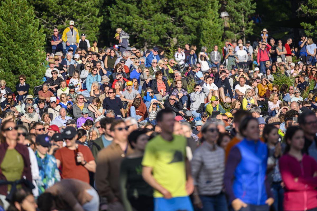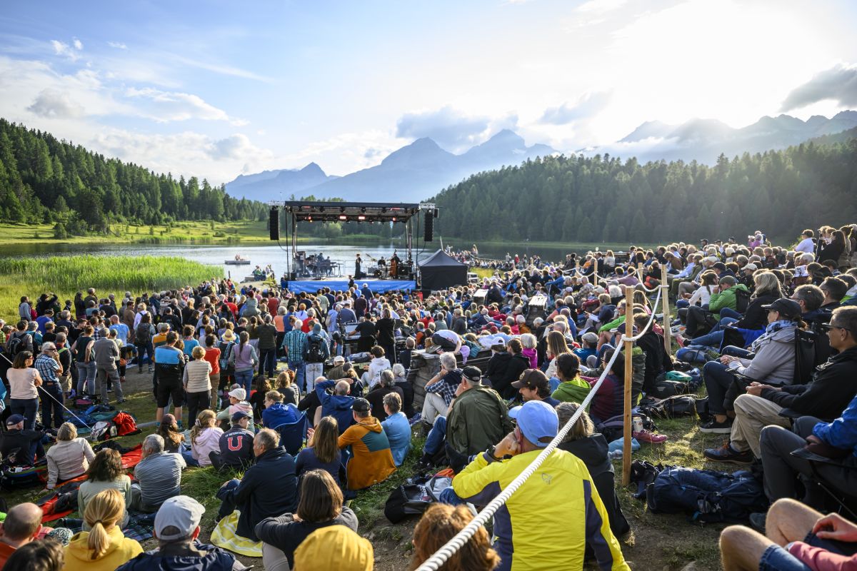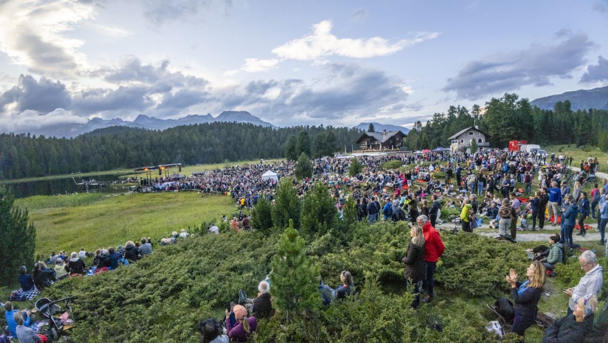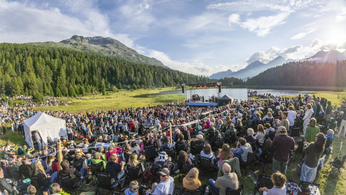 Sonntagabend, kurz vor 19 Uhr am Lej da Staz. Die Abendsonne taucht die Moorlandschaft in ein goldenes Licht. Von überall her strömen die Menschen zum Konzertareal, auf Velos, mit Kindern oder Hunden. Sie suchen sich ein Plätzchen zwischen dem Gebüsch, am Hang oder direkt vor der Bühne. Sie breiten auf Picknickdecken Essen und Getränke aus, schwatzen und lachen. Alte Bekannte begrüssen sich freudig, immer wieder winkt jemand jemandem aus der Ferne. Am Steg beim See geniessen einige die letzten Sonnenstrahlen, während andere schwimmen. Es riecht nach Pommes Frittes und Bratwurst, irgendwo lässt jemand den Korken einer Prosecco-Flasche knallen. Open-Air-Atmosphäre.