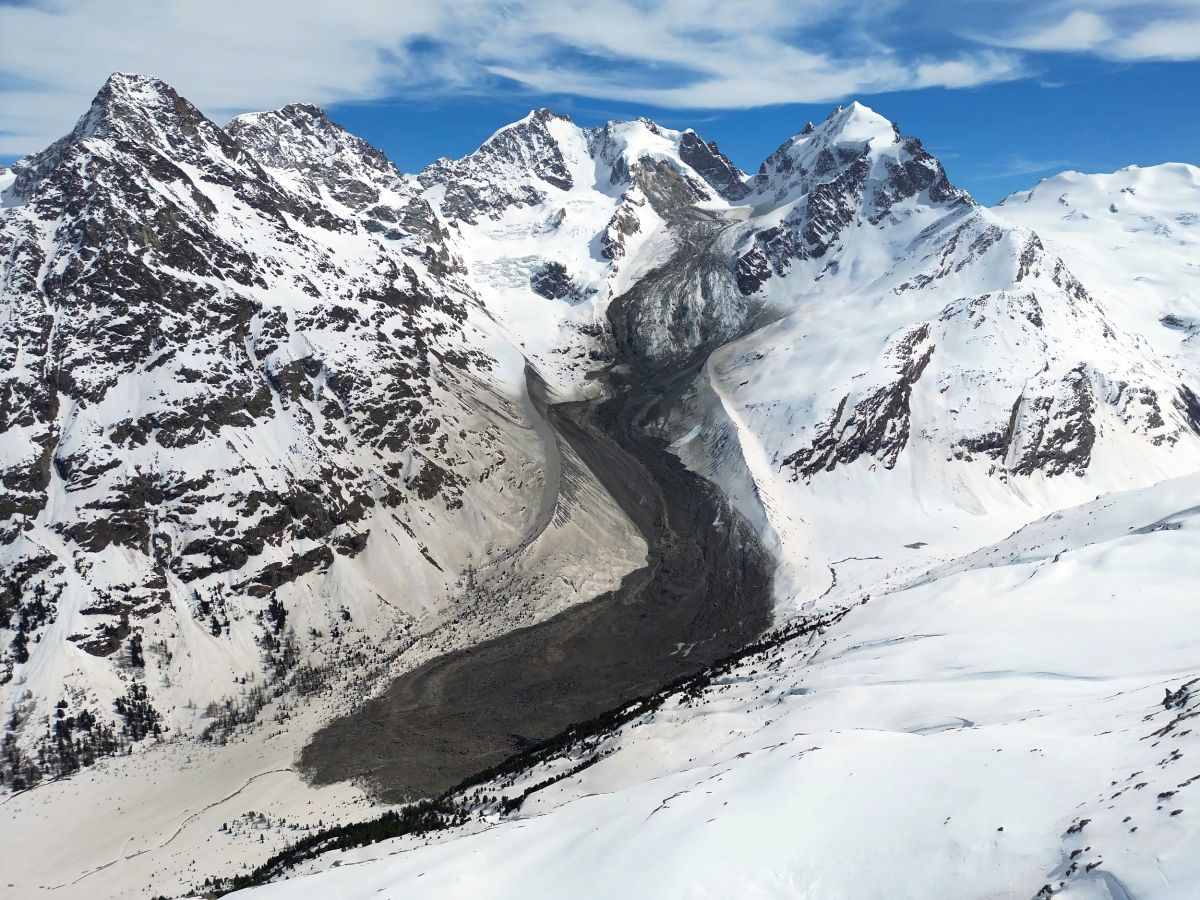 Der Bergsturz am Piz Scerscen hatte einen Schuttstrom aus Felsen, Eis und Schnee zur Folge, der sich von der Absturzstelle über sechs Kilometer bis in die obere Val Roseg bewegte. Foto: Gemeinde Samedan
