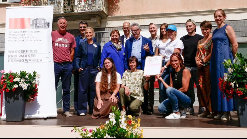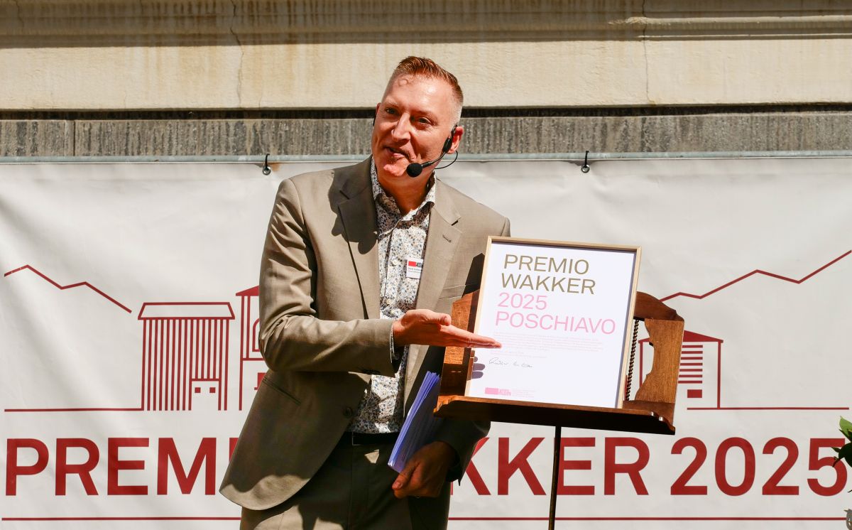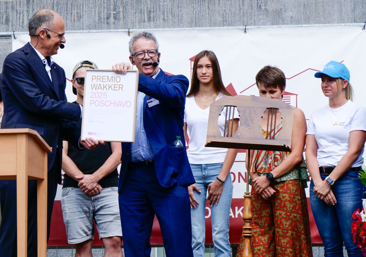 Am Samstag durfte Podestà Giovanni Jochum (links) den Wakkerpreis 2025 aus den Händen des Präsidenten des Schweizer Heimatschutzes, Martin Killian, entgegennehmen.