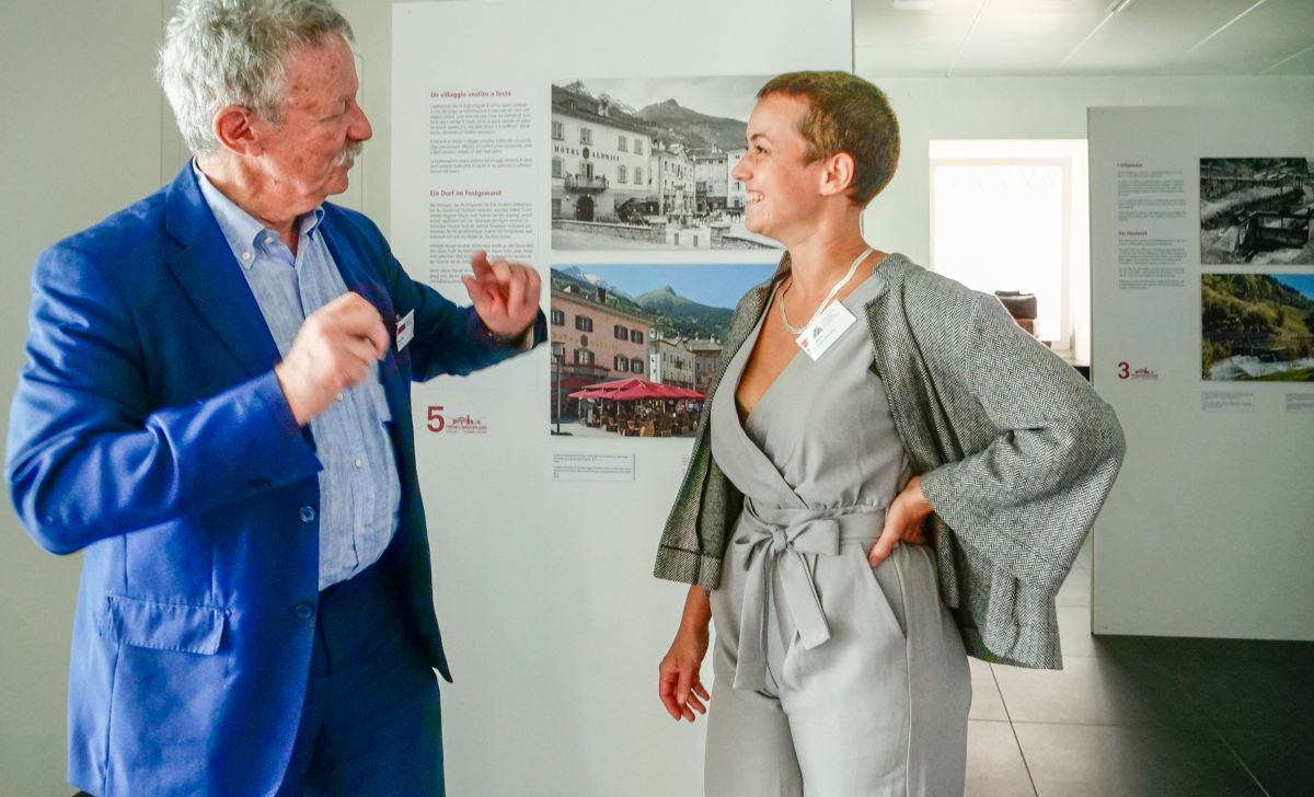 Martin Killias und die Projektleiterin Baukultur beim Schweizer Heimatschutz, Myriam Perret trafen sich in der Casa Olgiati mit dem EP-Redaktor zum Gespräch. Im Hintergrund Fotos der Ausstellung "Poschiavo wie es war".