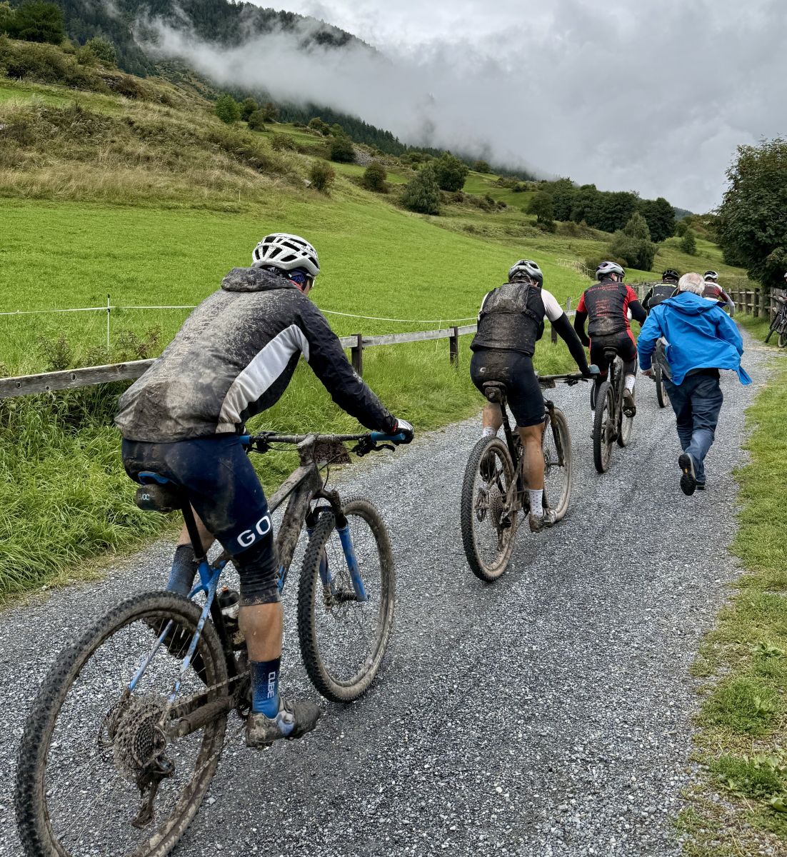 Der Regen hat aufgehört. Die Stimmung ist gut am Streckenrand bei Lavin. Es wird geplaudert, gelacht, Hopphopp und Heja gerufen. Erinnerungen an Ereignisse der Vorjahre werden ausgetauscht. Immer mehr Helfer und andere Familien treffen ein, um ihre Athletinnen und Athleten zu unterstützen. Der Erste, der vom offiziellen Nationalpark Bike-Marathon Team zu sehen ist, ist Michael Müller. Er rennt neben seinem Bike her. «Die Batterie ist leer», ruft er auf die Frage, ob er Hilfe benötige. Dann schwingt er sich wieder in den Sattel und fährt weiter. Ins Ziel wird er wenig später als 19. in der Königsdisziplin einfahren. Nach genau fünf Stunden und 110 Kilometern.