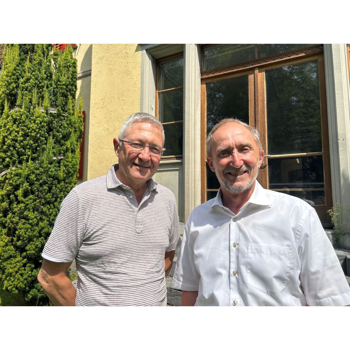 Ün grond relasch e s-charsas regordanzas – l’anteriur president Vincent Augustin (a schnestra) e l’actual secretari da la Lia Rumantscha Markus Solinger raquintan da l’ierta Fallet (fotografia: Claudia Cadruvi).