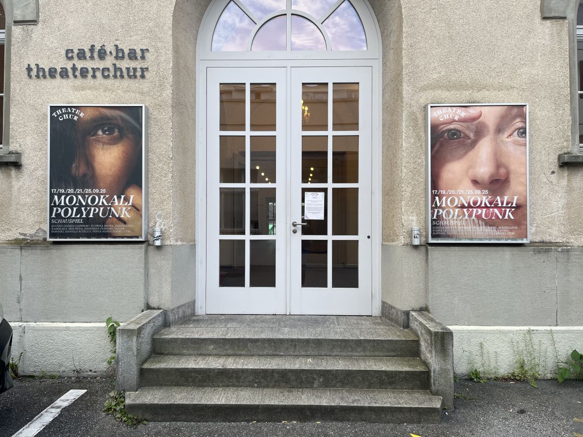 Ils placats cullas duos auturas pro ün’entrada al Teater Cuira: Gianna Olinda Cadonau (a schnestra) e Flurina Badel (a dretta) han scrit insembel il toc «Monokali Polypunk» chi ha premiera in marcurdi (fotografia: David Truttmann).